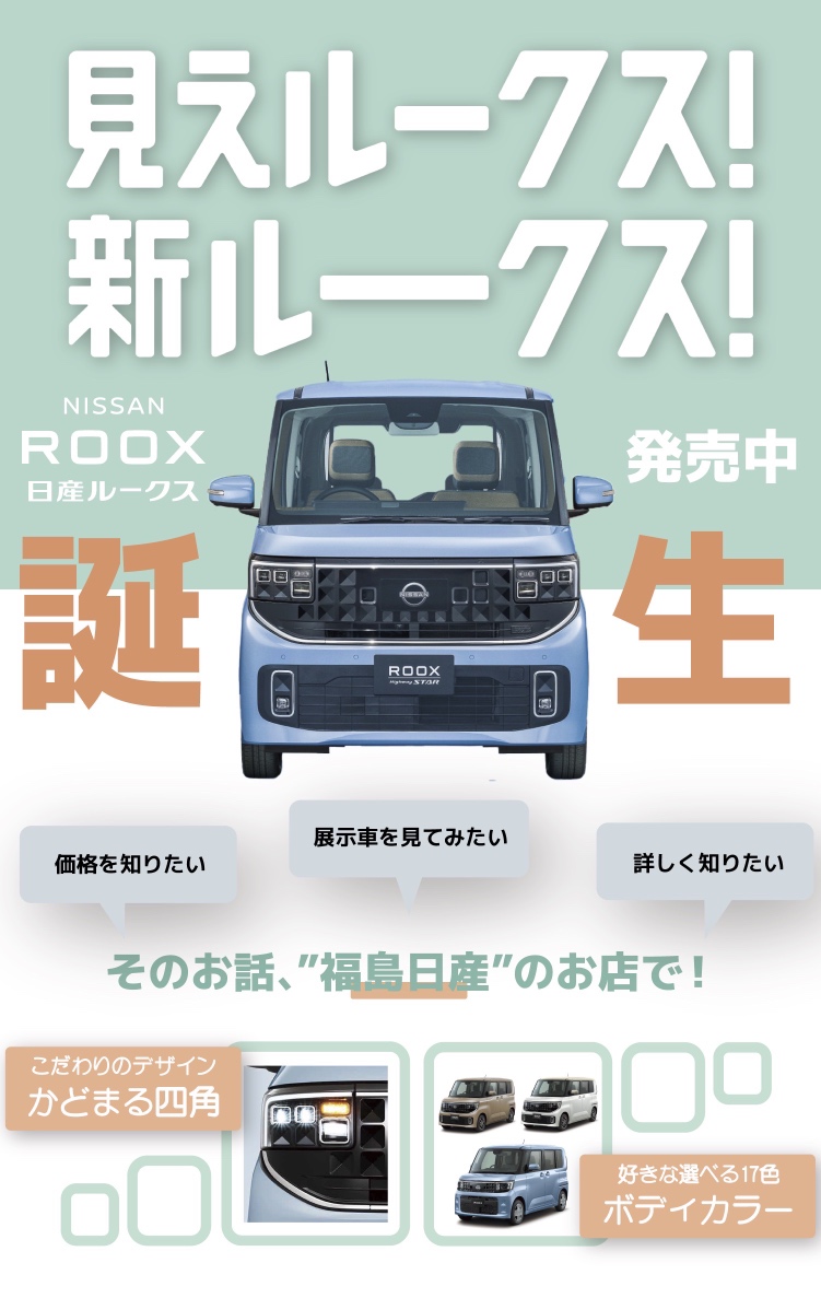先行披露されたばかりの新型日産ROOXが早速特別展示されましたのでじっくり紹介いたします。福島日産にてご注文受付中です。